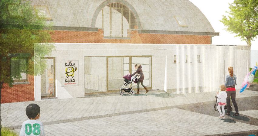 L'entrée se fait via une fenêtre de l'actuel local de soins, dont l'allège est démolie de manière à créer une porte adaptée à la fois aux personnels, aux parents, aux PMR et aux livraisons. Passé le sas d'entrée, les visiteurs trouveront le bureau sur la gauche. Celui-ci et idéalement situé pour à la fois le contrôle et la relation entre le personnel et les visiteurs. Les parents se dirigent vers la droite où un espace leur est réservé. Ils peuvent y changer leur enfant avant de la remettre aux puéricultrices. Les effets des enfants sont laissés dans un casier à double face également accessible directement depuis l'espace de change. Sous celui-ci, quelques maxi-cosy peuvent être laissés par les parents, alors que les poussettes sont laissées dehors, dans un local prévu à cet effet.
