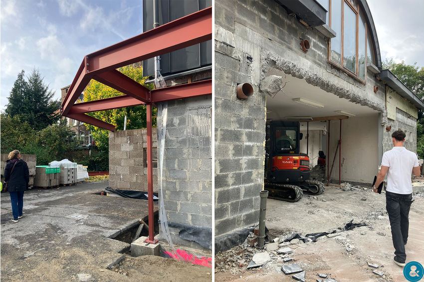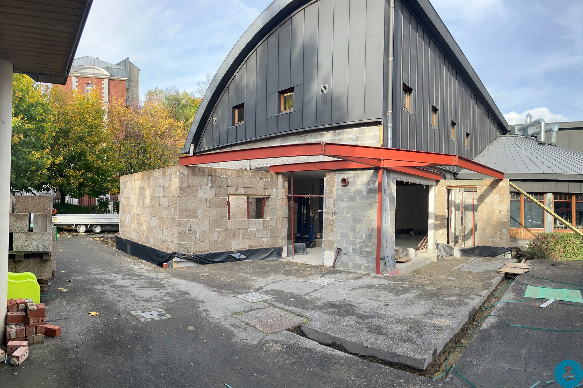 L'espace d'activité se développe en L. De cette manière, il profite des grandes baies existantes et peut offrir des espaces aux ambiances variées, adaptée aux besoins des enfants aux divers moments de la journée. Il se prolonge à l'extérieur où un espace minéral et un espace végétal sont aménagés.