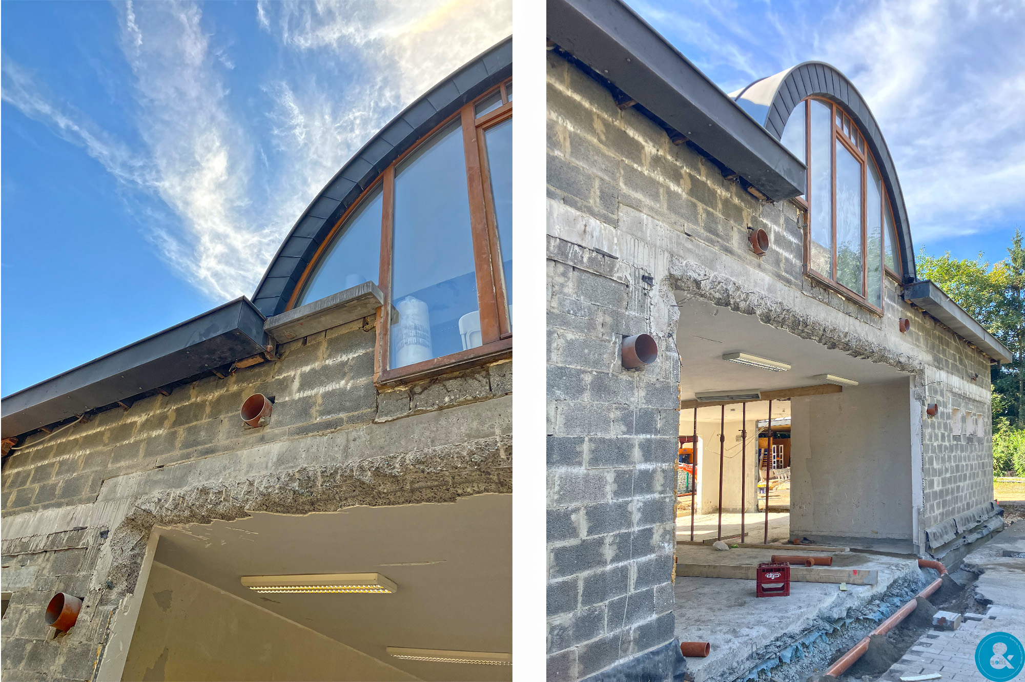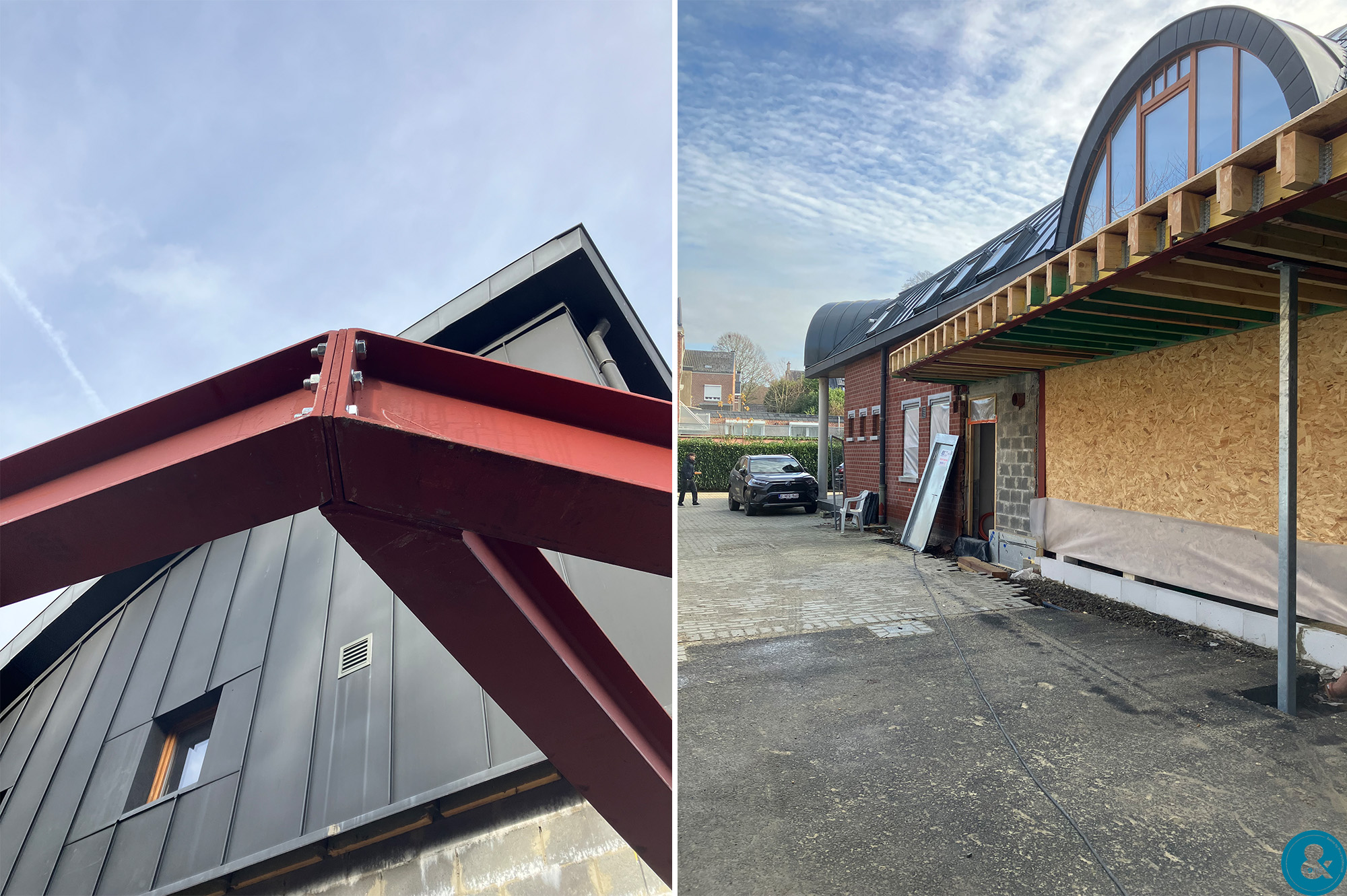 Deux locaux dodo sont aménagés. L'un dans l'emprise du bâtiment existant, l'autre via une extension. Celle-ci est jouxtée au local poussettes et, via des auvents apportant à la fois une unité architecturale et les pare-soleils nécessaires à éviter les surchauffes, se développe sur les trois côtés du bâtiment. Celle-ci est imaginée en bardage zinc à joint debout bilaqué blanc.