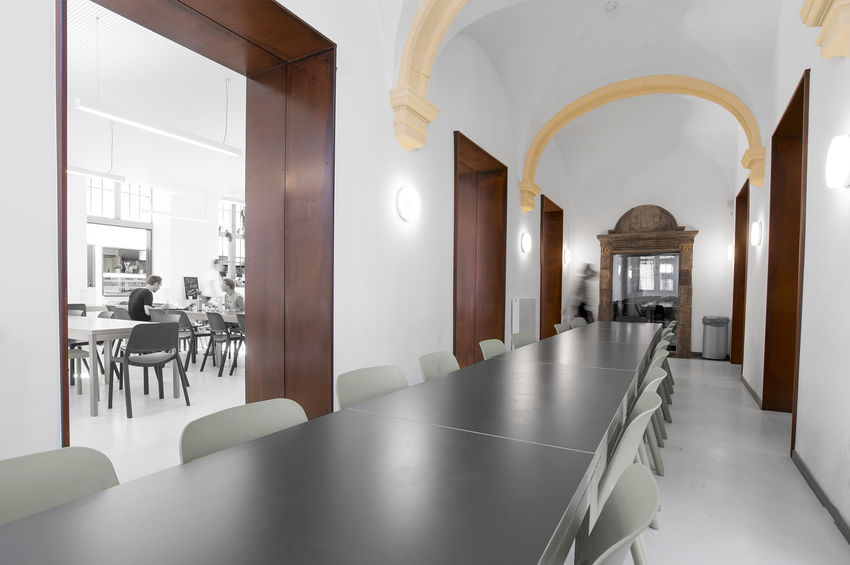 Le parti architectural du mobilier consiste à retrouver la symbolique de ce lieu chargé d'histoire en adaptant respectueusement et rationnellement le patrimoine du site, plus ou moins récent. L'auberge nécessite un aménagement fun et accueillant à l'image de ce qui l'entoure, et des jeunes qui en jouiront. Le mobilier y est donc déterminant. Tantôt ouvert, simple et d'une grande autonomie dans les espaces plus polyvalents, tantôt plus fermé et travaillé comme des alcôves plus intimes, le mobilier répond avec robustesse, grâce à des matériaux nobles, suivant l'atmosphère de la pièce, aux besoins de la clientèle.