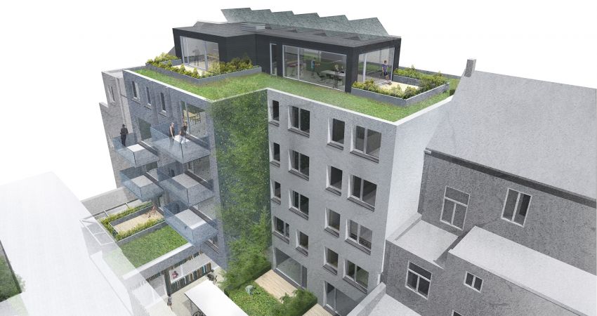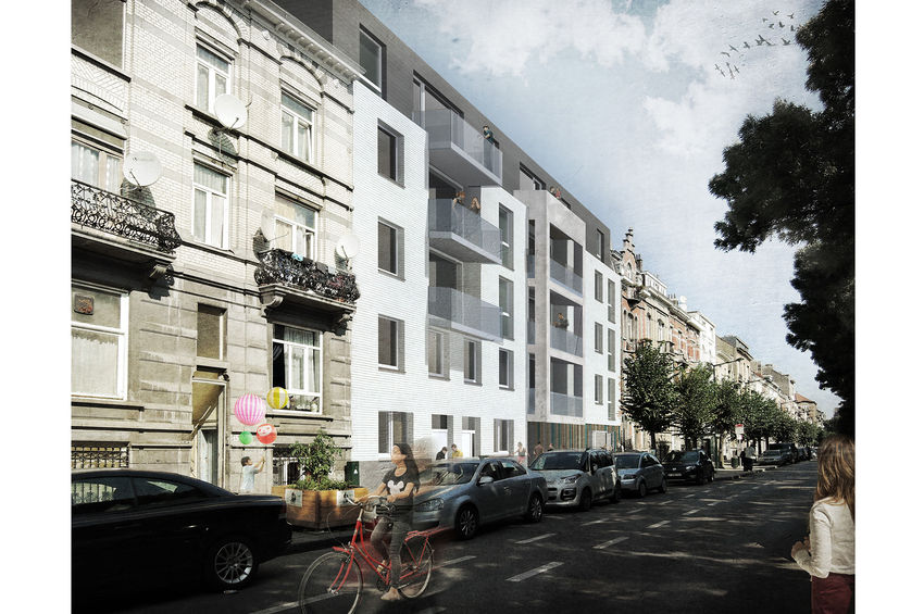 Le projet se développe Boulevard Emile Bockstael, il fait partie du programme de revitalisation du Contrat de Quartier Durable Bockstael. Ce programme met en valeur l'espace public, cherche à retisser des liens entre les axes traversant le quartier et investit plusieurs infrastructures pour y développer des lieux d'activités ainsi que du logement. Une connexion traversant la parcelle est prévue pour relier le boulevard Bockstael et la promenade verte.. Notre projet s'inscrit en plein dans ce contexte. La connexion prévue sera renforcée par le choix programmatique que nous proposons : ce sont des locaux pour le service plantations et un espace polyvalent qui seront placés au rez-de-chaussée et qui feront le lien avec les nombreuses activités déjà présentes en fond de parcelle. Un traitement particulier accompagnera cette connexion que nous appellerons le "cordon de bois" de sorte à permettre une meilleure visibilité des ateliers, des asbl et des bureaux de soutien à la recherche d'emploi situés en intérieur d'ilot... Ce traitement est renforcé par le contraste qu'il installe avec l'architecture du bâtiment qu'il traverse. Ce dernier s'efface et s'inscrit dans la continuité du bâti existant.