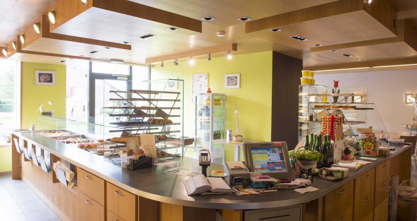 Le magasin est aménagé d’un grand comptoir qui sépare la zone client de la partie privée (atelier, cuisine, ...). Sa forme en L guide les clients vers l’espace de dégustation. Pour la marchandise, l’étude a tenu compte de l’éclairage,des règles d’hygiène et des températures nécessaires.