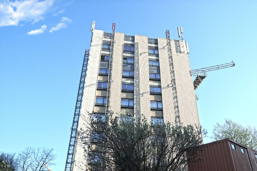 Par l'amélioration de la performance énergétique de l'enveloppe du bâtiment, nous donnons un second souffle à l'apparence extérieure du bâtiment de caractère fonctionnaliste des architectes Vanden Bossche, tout en respectant son aspect d'origine. En effet, si les couleurs demeurent semblables à l'existant, la pose verticale d'un parement en briques permet de donner une touche contemporaine au bâtiment. Cette intervention tout en sobriété est rehaussée par les notes colorées au niveau du renfoncement des balcons et par la création d'un auvent à l'entrée du bâtiment. L'auvent, réalisé en tôle perforée - rappel des garde-corps –, permet d'accueillir les visiteurs et d'intégrer judicieusement la parlophonie, l'éclairage et la signalétique du bâtiment. Cela garantie de façon simple la sécurité aux abords du bâtiment et permet de privatiser le balcon se trouvant à proximité de l'entrée.